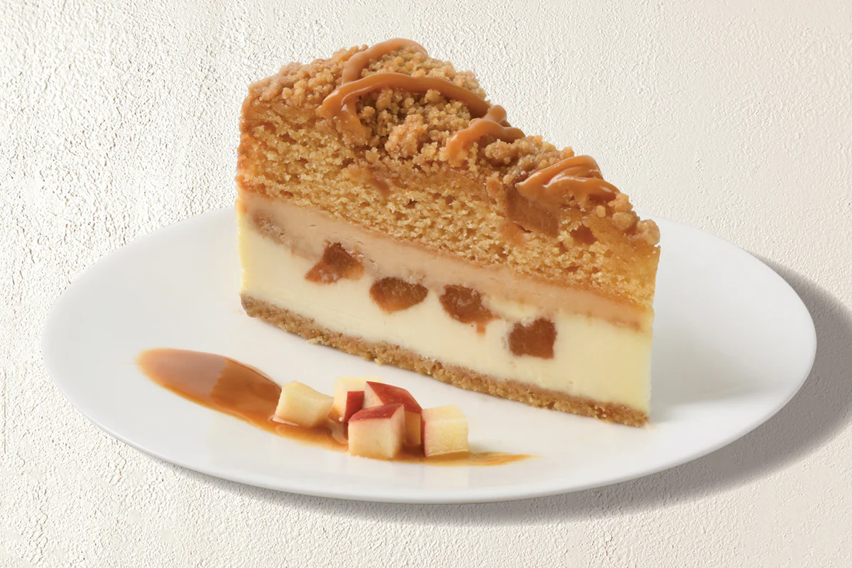 The Cheesecake Factory Caramel Apple Crunch Cheesecake, served warm with Carmel Drizzle